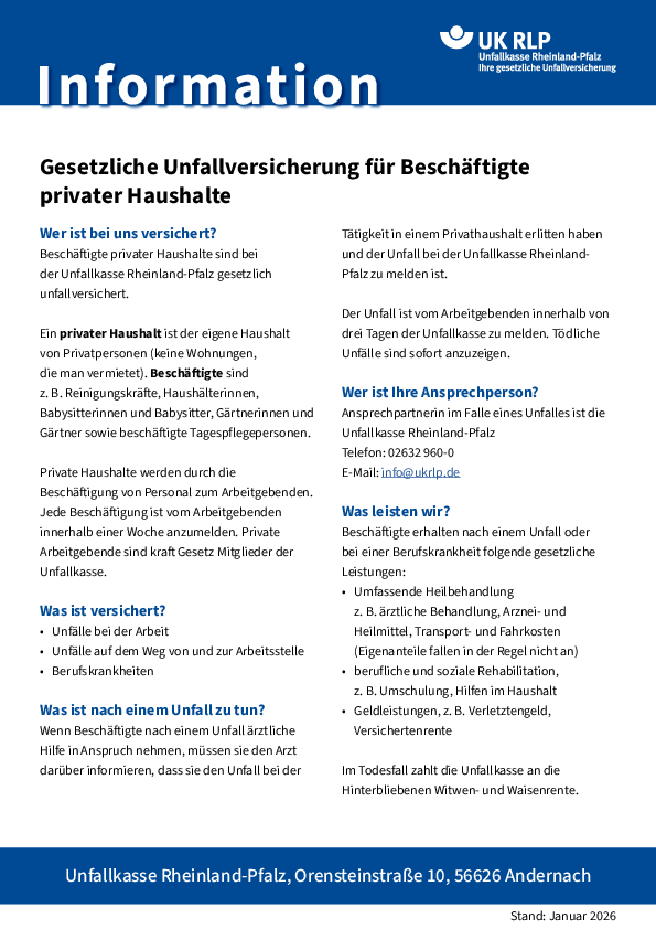 Die gesetzliche Unfallversicherung ist für die Beschäftigten beitragsfrei. Die Kosten werden vom Arbeitgeber – das heißt dem Haushaltsführenden – getragen. Die Leistungen reichen von der medizinischen Heilbehandlung bis zur lebenslangen Rente.Die Beschäftigung ist vom privaten Haushalt innerhalb einer Woche anzumelden.