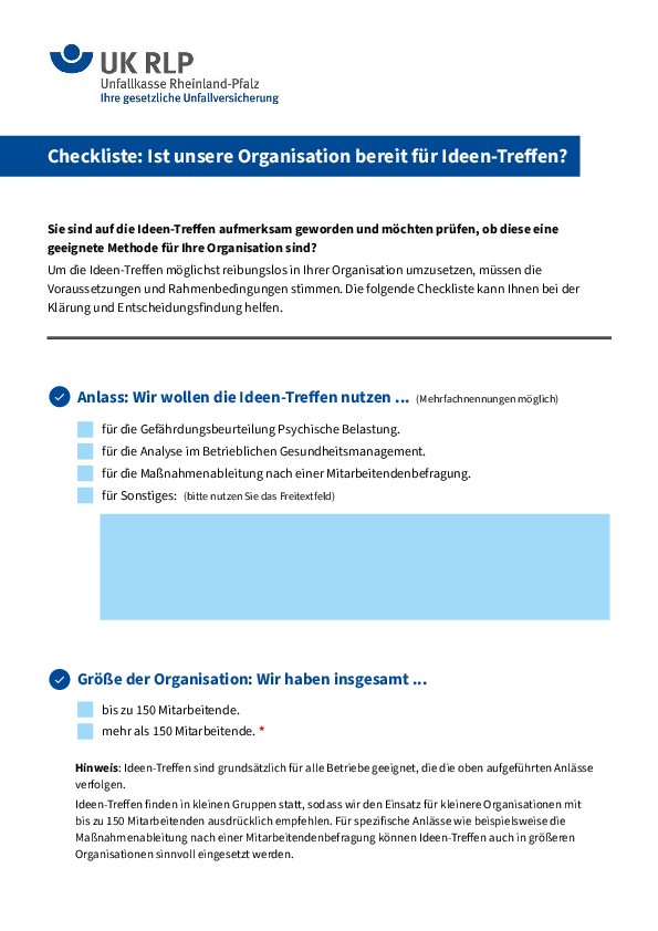 Unsere Checkliste kann Ihnen dabei helfen, die notwendigen Klärungen und Entscheidungen zu treffen, um festzustellen, ob die Ideen-Treffen eine geeignete Methode für Ihre Organisation sind.